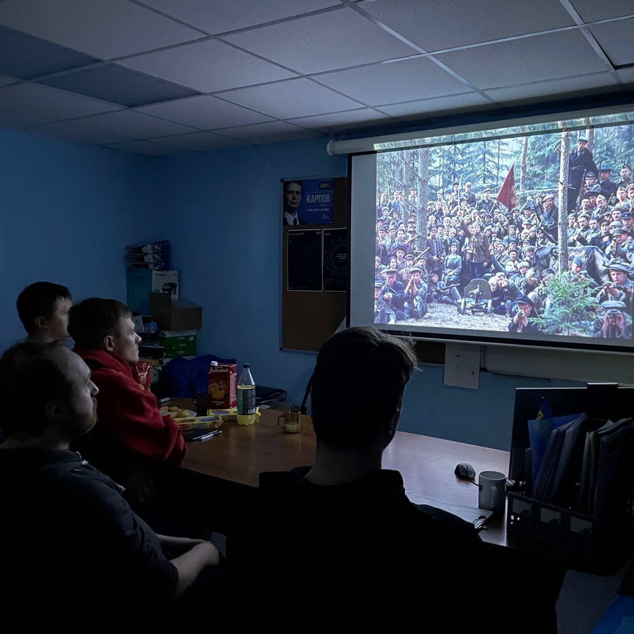 Помимо возложения активисты, совместно с депутатом Думы Города Томска от ЛДПР Александром Полевечко, организовали просмотр фильма Элема Климова «Иди и смотри»