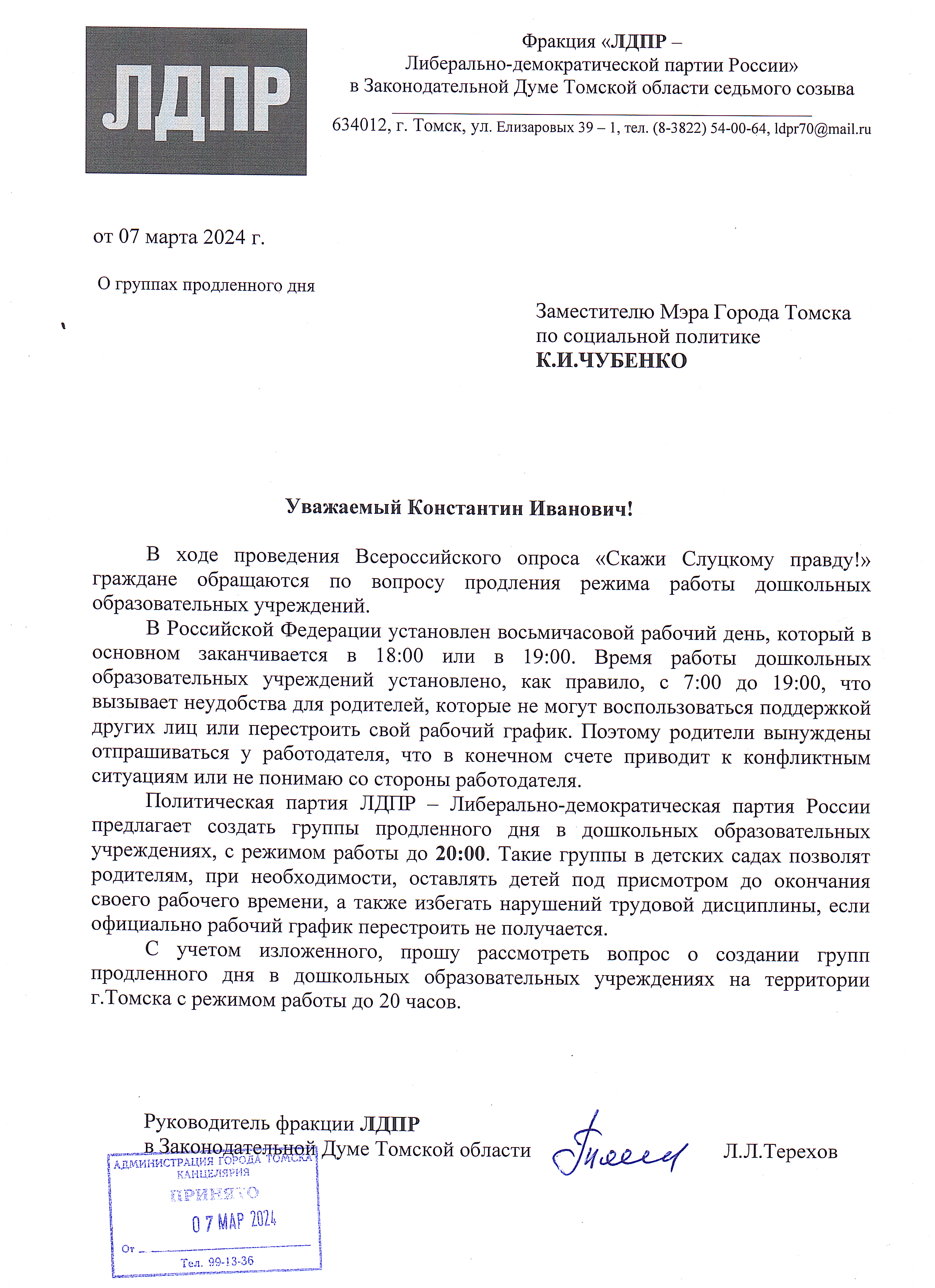 «В ходе проведения Всероссийского опроса граждан «Скажи Слуцкому правду!» жители обращаются по вопросу продления режима работы дошкольных образовательных учреждений. По Трудовому кодексу РФ установлен восьмичасовой рабочий день, который в основном заканчивается в 18:00 или в 19:00. Время работы дошкольных образовательных учреждений, как правило, с 8:00 до 18:00, что неудобно для тех родителей, которые не могут воспользоваться поддержкой других лиц или перестроить свой рабочий график. Люди вынуждены отпрашиваться у работодателей, что в конечном счёте приводит к конфликтным ситуациям или непониманию со стороны работодателей», – уточняет проблему Депутат Закдумы Томской области от ЛДПР Леонид Терехов.