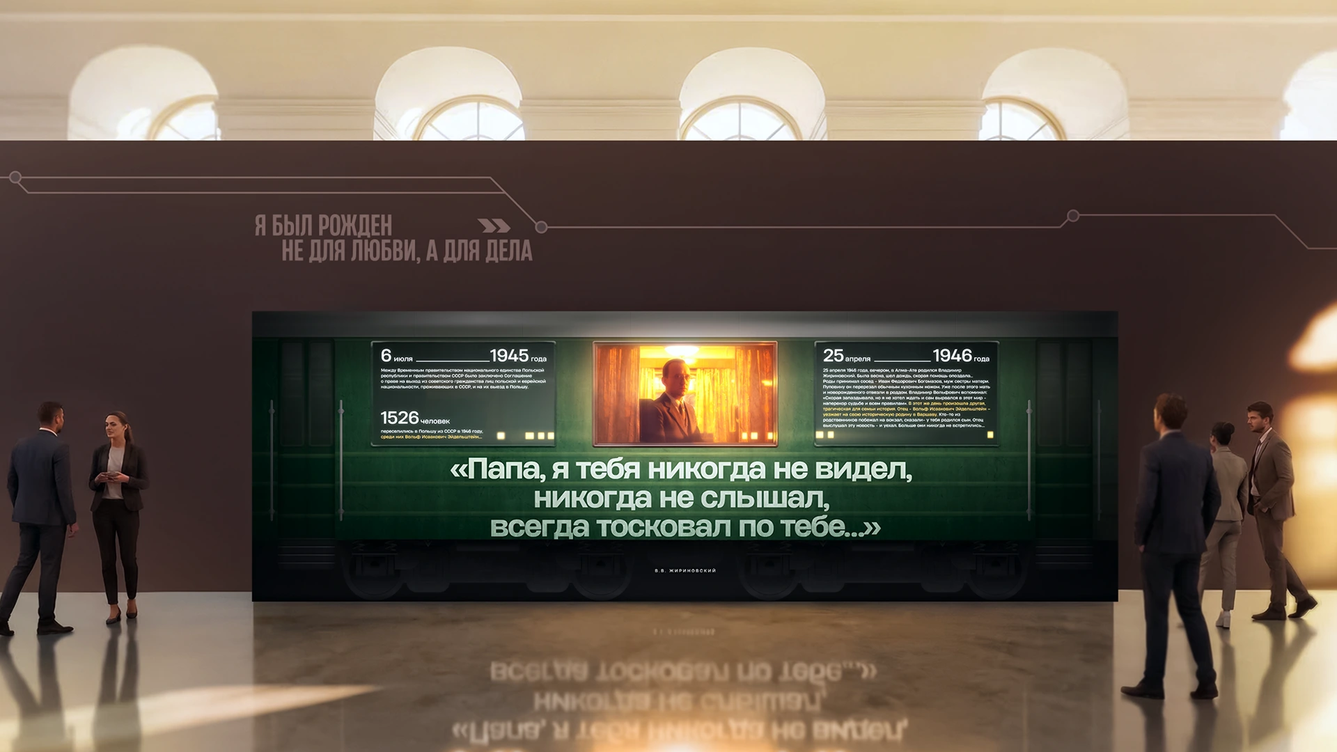 Магистральным образом экспозиции станет поезд. Почему поезд? Три причины. Первая: название “Продолжение” требует движения. Вторая: агитпоезд Жириновского в 90-х — его личное ноу-хау, визитная карточка ЛДПР. Третья: каждая станция — этап жизни Владимира Вольфовича и веха истории страны».